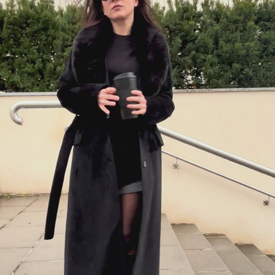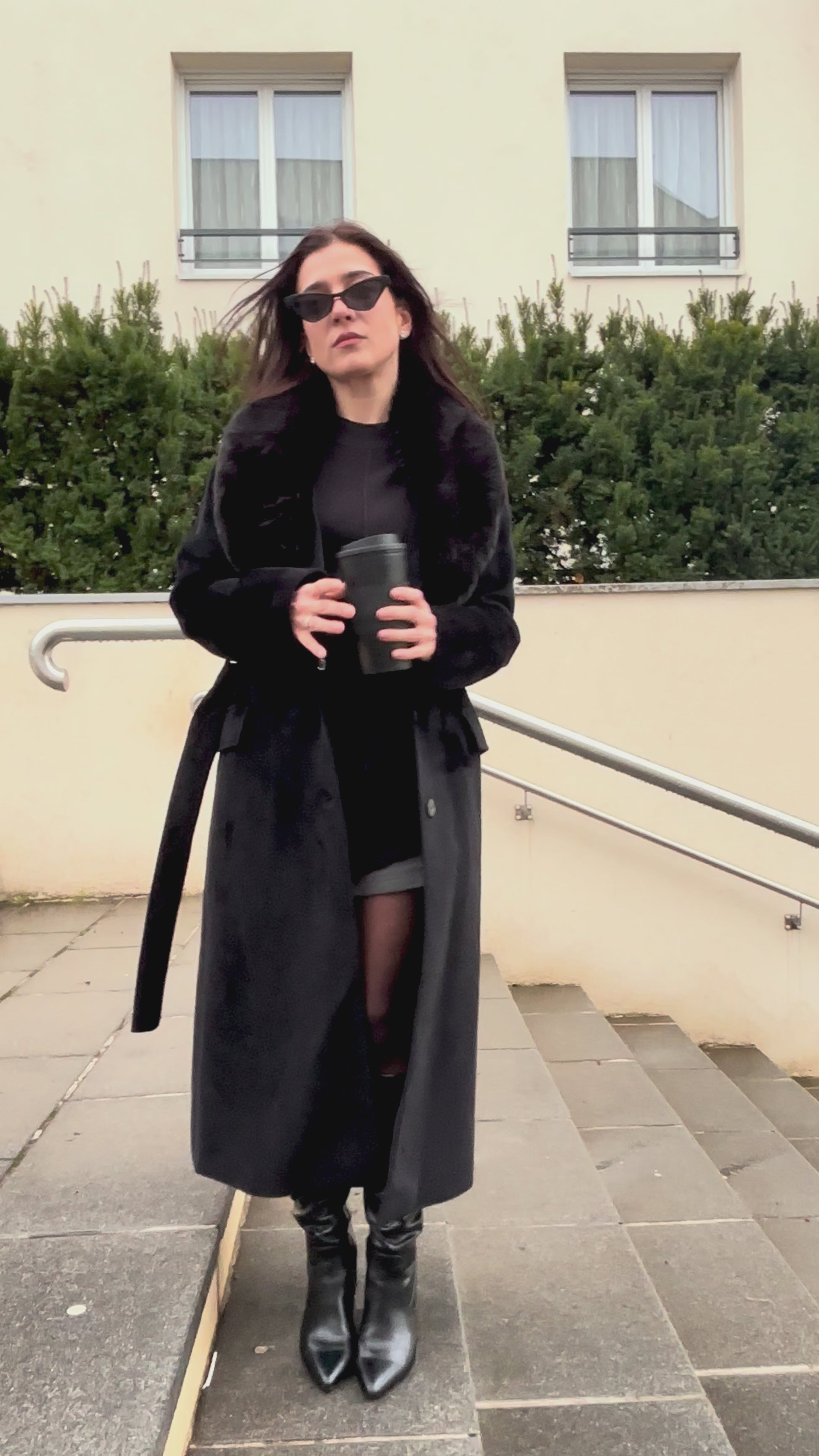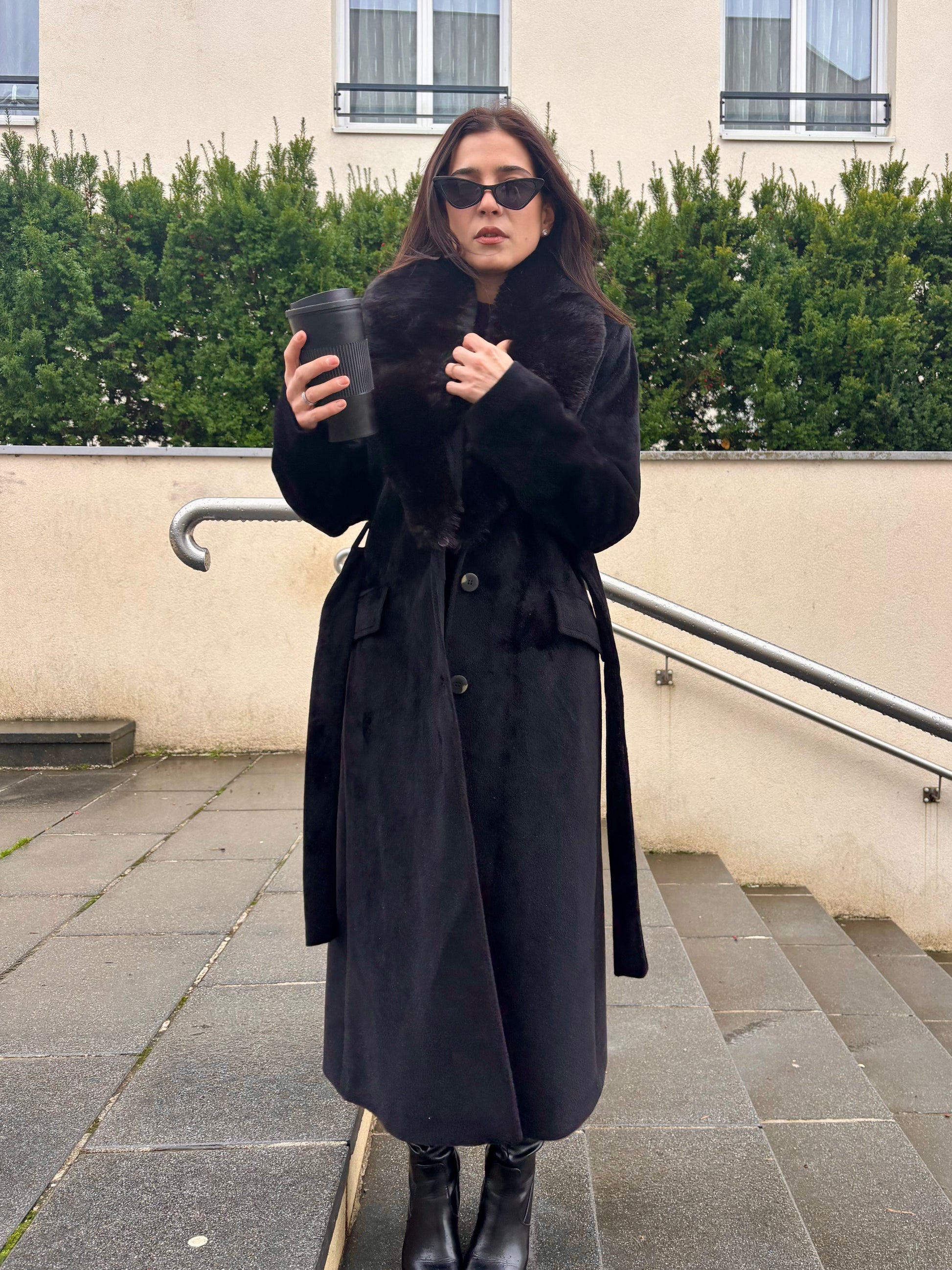 Ce manteau noir avec fourrure amovible (clipstante) apporte une touche chic et chaleureuse à toutes vos tenues. Sa ceinture met la silhouette en valeur, tandis que les poches ajoutent un côté pratique et confortable. Un indispensable pour un look hivernal élégant.